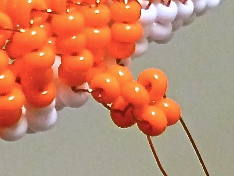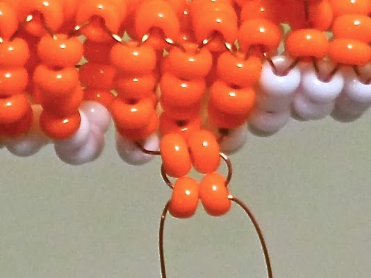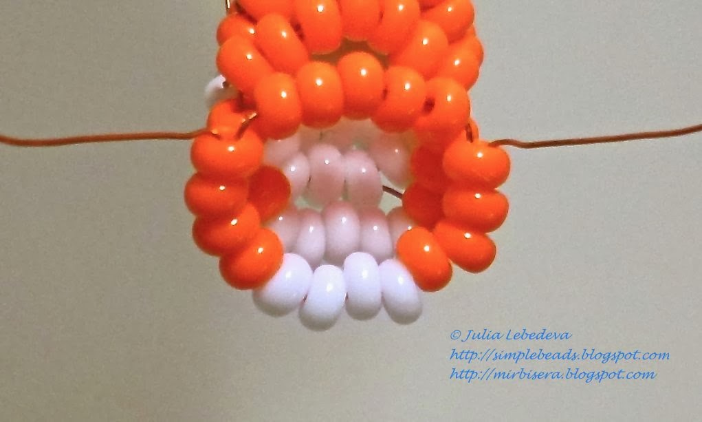Нижний ярус — набираем бисеринки в следующем порядке: 4 оранжевые, 3 белые и ещё 4 оранжевые.