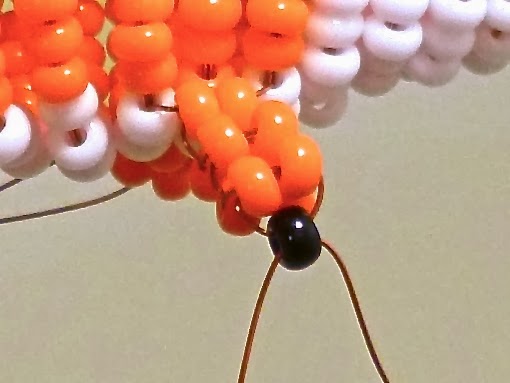 Верхний ярус — набираем бисеринки в следующем порядке: 1 оранжевая, 1 чёрная, 2 оранжевые, 1 чёрная, 1 оранжевая.