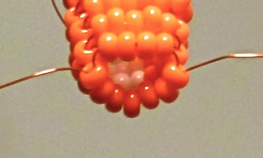 Верхний ярус — набираем 9 оранжевых бисеринок, пропускаем через них другой конец проволоки, но проволоку пока туго не затягиваем.