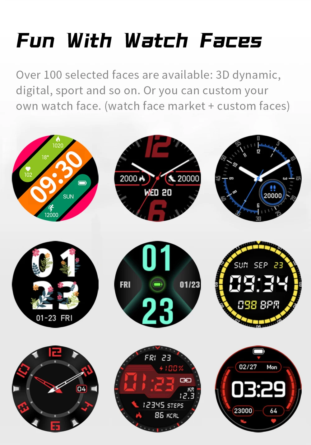 Доступно более 100 наклонных лиц, 3D динамический, цифровой, спортивный и сын на, или вы можете настроить свой собственный циферблат часов, (watch face market + custom faces)
