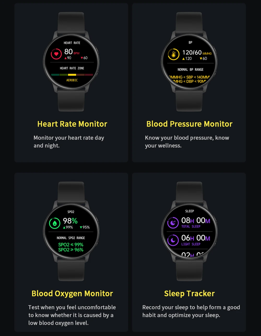 * Здравоохранение: монитор сердечного ритма, монитор артериального давления, Монитор кислорода в крови, трекер сна, дыхательные упражнения, время перерыва и т. Д.* Фитнес-трекер: шаги, сожженные калории, расстояние, мульти-спортивные режимы (Велоспорт, плавание, бег, туризм, прогулки и т. д.) запись данных о фитнесе.* Помощник по жизни: включите запястье для пробуждения, синхронизация уведомлений, напоминание о сидячем положении и тревоге, пульт дистанционного управления камерой, запись фитнес-данных, секундомер, таймер, будильник, погода, управление музыкой, напоминание о сидячем положении, напомните воду, фонарик. И т. д.