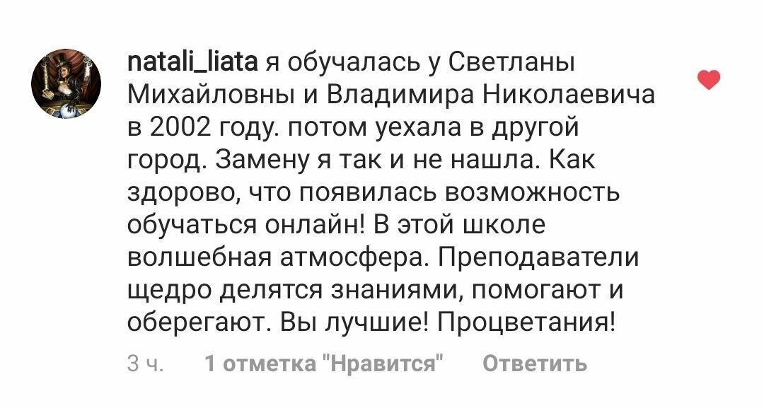 Я обучалась у Светланы Михайловны и Владимира Николаевича в 2002 году, потом уехала в другой город. Замену я так и не нашла. Как здорово, что появилась возможность обучаться онлайн! В этой школе волшебная атмосфера. Преподаватели щедро делятся знаниями, помогают и оберегают. Вы лучшие!