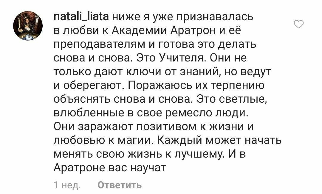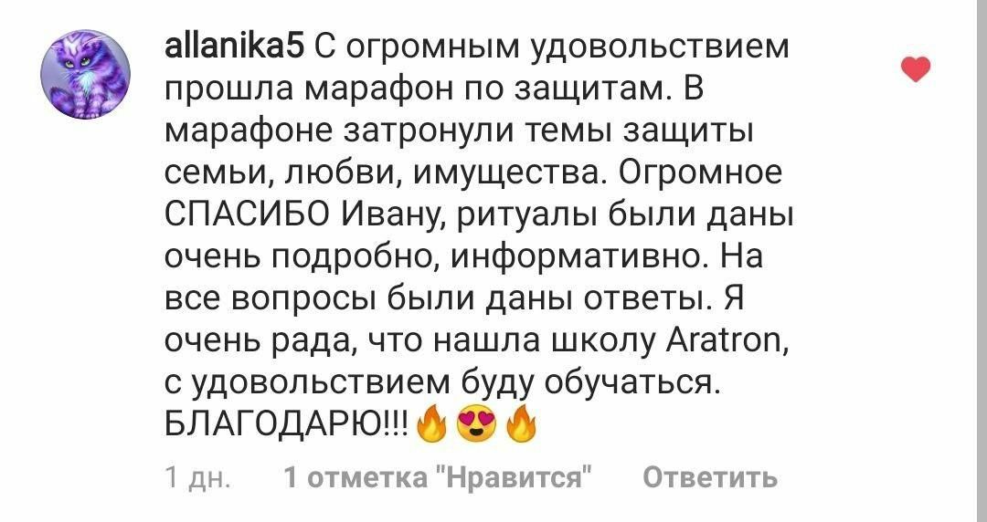 Я очень давно мечтала учиться в школе Аратрон, но не имела возможности попасть на очное обучение .т.к живу в другом городе. В этом году мне повезло школа Аратрон впервые объявила курсы онлайн. Сюда я пришла с доверием и надеждой для получения необходимых мне знаний и не ошиблась в выборе. Хочу поблагодарить Владимира Николаевича за курс по ритуальной магии.