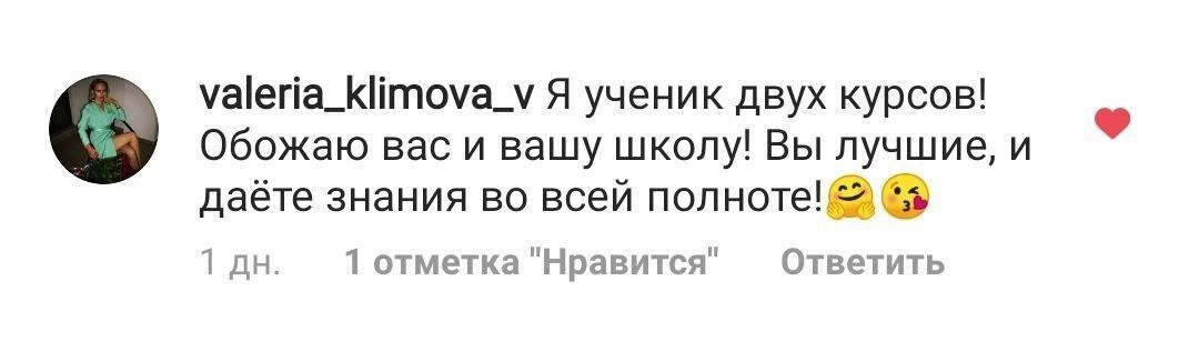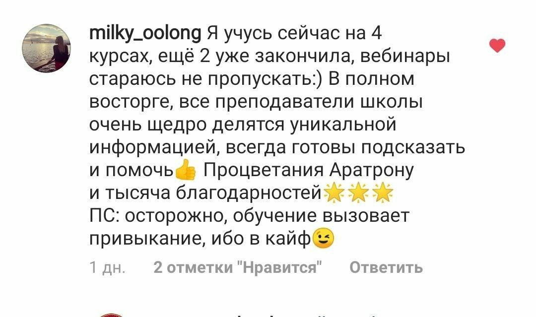 В процессе учебы я узнала много новых ,интересных и главное работающих практик. Есть огромное желание и дальше продолжить обучение в этой школе..