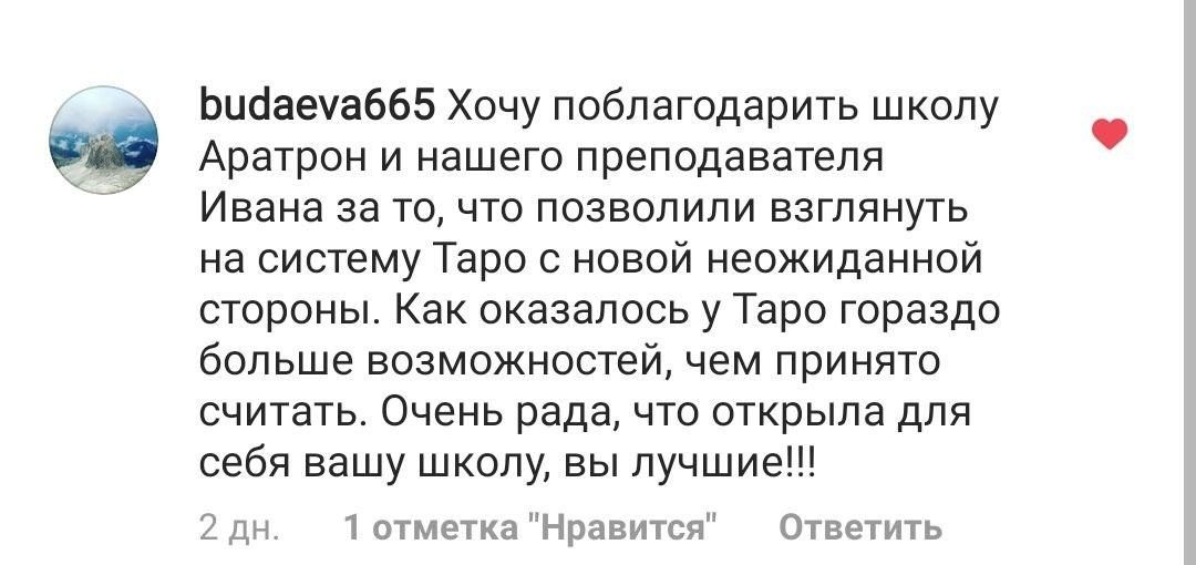 В 2016 году я пришла учиться Таро в школу «Аратрон»,и открыла дверь в новый мир. Мир, в котором ты не просто зритель. Мир, в котором ты можешь подсмотреть, куда ведет дорога по которой ты идешь. Мир, в котором ты учишься верить себе и своим возможностям. Знания учителей школы кажутся неисчерпаемым источником.