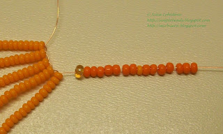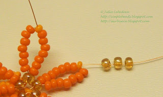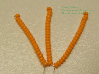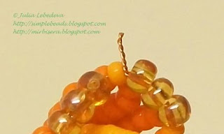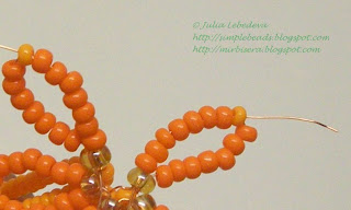 Далее снова набираем на проволоку 1 большую янтарную бисеринку, затем 7 тёмно-оранжевых, затем 1 светло-оранжевую и ещё 7 тёмно-оранжевых бисеринок.