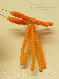 Далее, продолжая плетение на длинном конце проволоки, начинаем делать юбку медузы. Набираем на проволоку последовательно 1 большую янтарную бисеринку, затем 7 тёмно-оранжевых бисеринок, 1 светло-оранжевую и ещё 7 тёмно-оранжевых бисеринок.