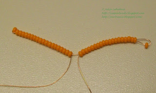 Далее плетение ведём только на длинном конце проволоки; короткий конец проволоки не трогаем до завершающего этапа плетения. Набираем на длинный конец проволоки ещё 20 светло-оранжевых бисеринок.