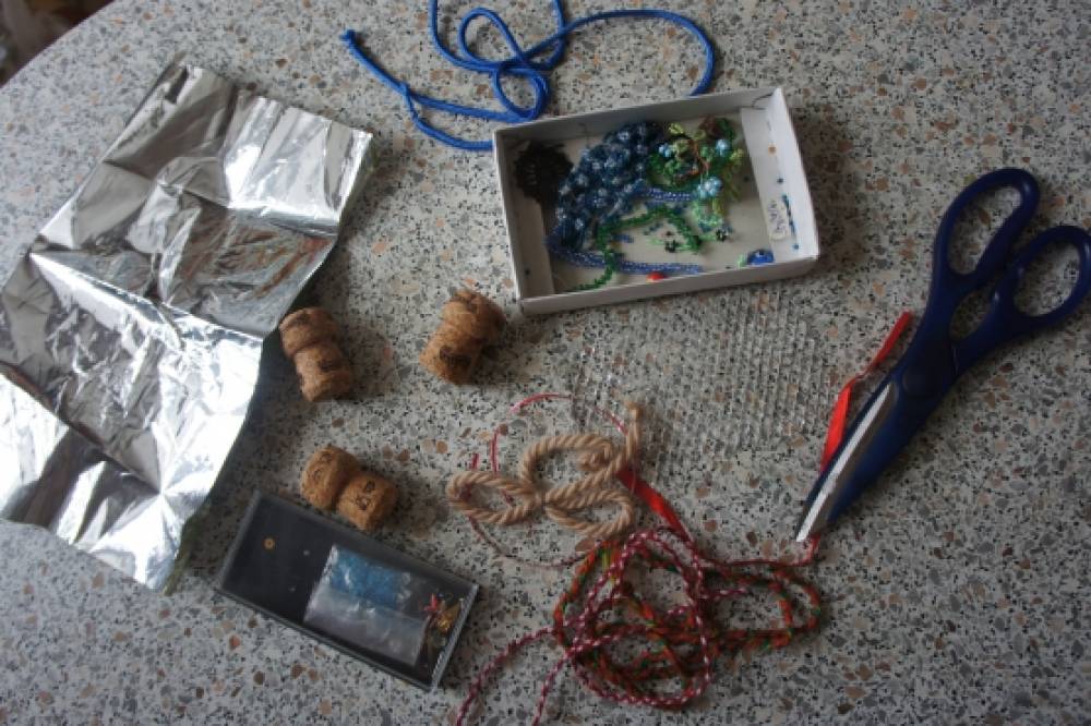Для работы нужны пробки от Шампанского,бусинки или бисер (для глаз,шнурочки,верёвочки,узкие ленточки (для шарфика,ножницы,клей «Момент»,фольга или обёрточная бумага нежных тонов (для крылышек,белая гуашь и кисть (или корректирующая жидкость).