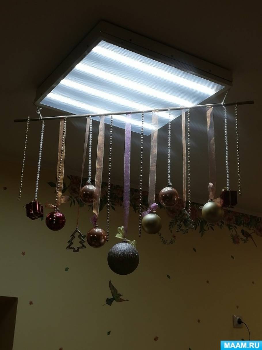 Сказочную атмосферу мы создали не только в группе, но и в нашей приемной. Потолок мы украсили с помощью елочных игрушек. Для такого декора лучше комбинировать елочные шары и светящиеся светодиодные гирлянды. Они отлично смотрятся вместе и дополняют друг друга.