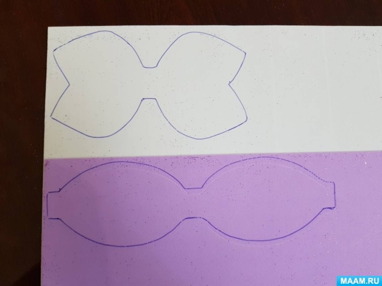 Сначала изготовим шаблоны для бантика из бумаги, их можно найти в просторах интернета на любой выбор. Заранее рисуем шаблон на бумаге, после чего вырезаем его.