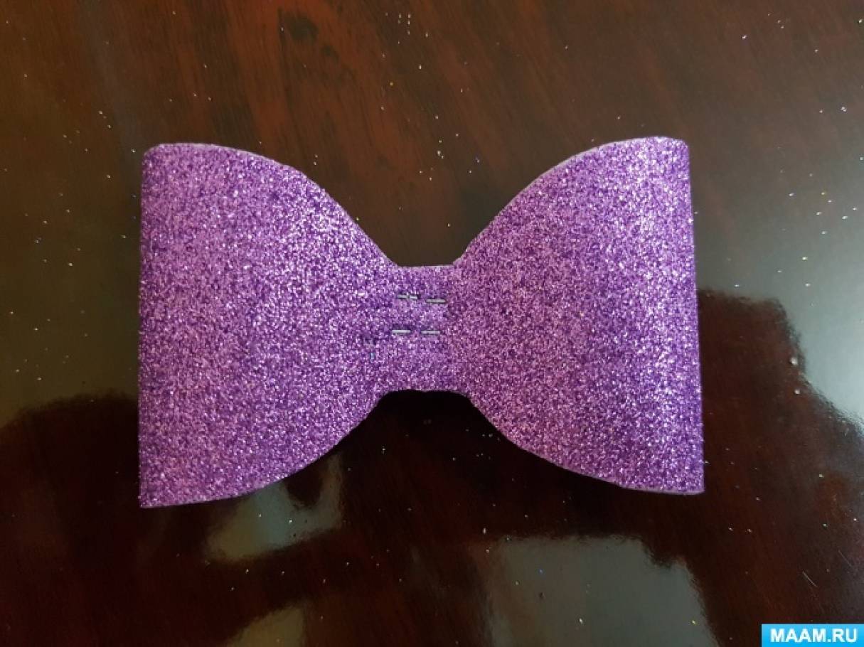 Теперь контуры этих шаблонов требуется перенести на фоамиран. Для основного цвета бантика я выбрала серый цвет, для верхнего бантика — сиреневый цвет. Переносить будем на изнаночную сторону листа фоамирана. Для этого прикладываем бумажный шаблон бантика к изнаночной стороне глиттерного фоамирана, после чего по краю обводим и вырезаем.