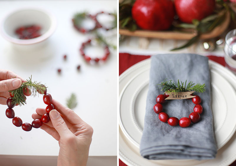Можно пойти дальше, сделав своими руками нарядные мини-венки из клюквы и небольшого количества зелени. Сюда же прикрепляем маленький кусочек бумаги с именем и вуаля, получаем невероятно эффектное украшение для нашего новогоднего стола.