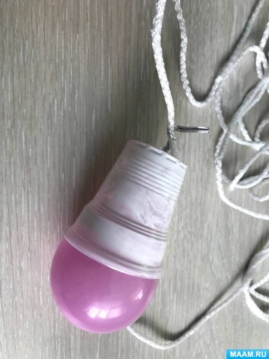 - Проколите дно стаканчика иголкой, в которую предварительно вдели ленточку от дождика.