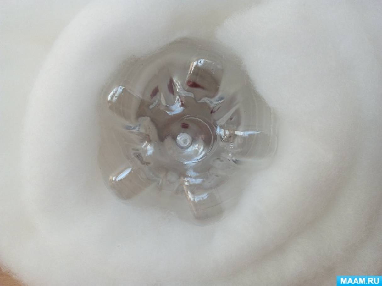 Шаг 5. В нижнюю часть снеговика вставляем 1,5-литровую пластиковую бутылку (для того,чтобы туловище снеговика стало плотнее и устойчивее).