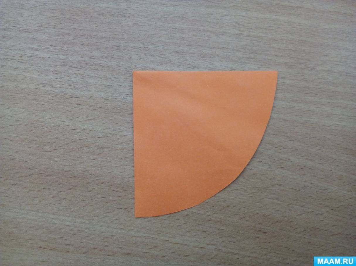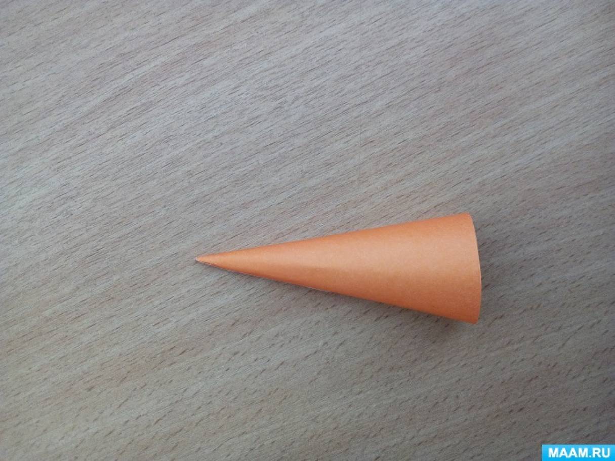 Шаг 12. Из оранжевой бумаги мастерим нос-морковку и приклеиваем.