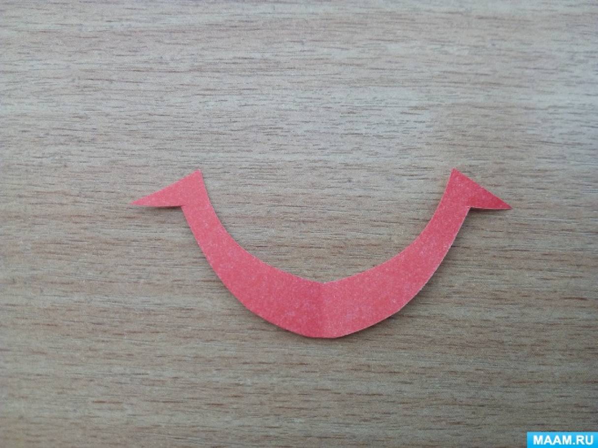 Шаг 13. Из красной бумаги вырезаем улыбку и приклеиваем.
