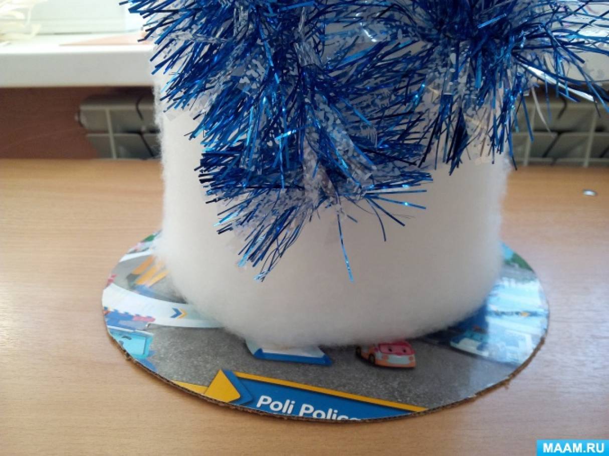 Шаг 9. Из мишуры собираем помпон и пришиваем к шапке снеговика.