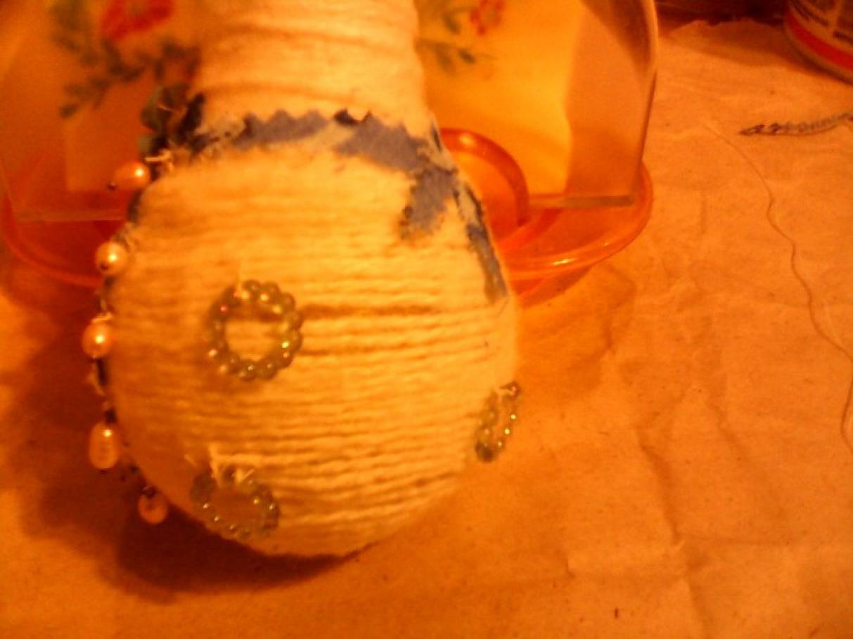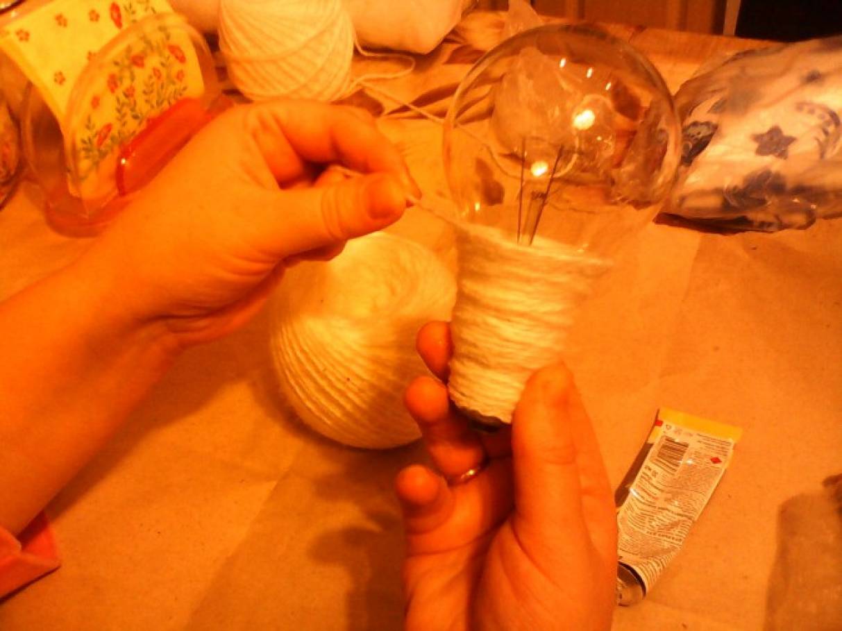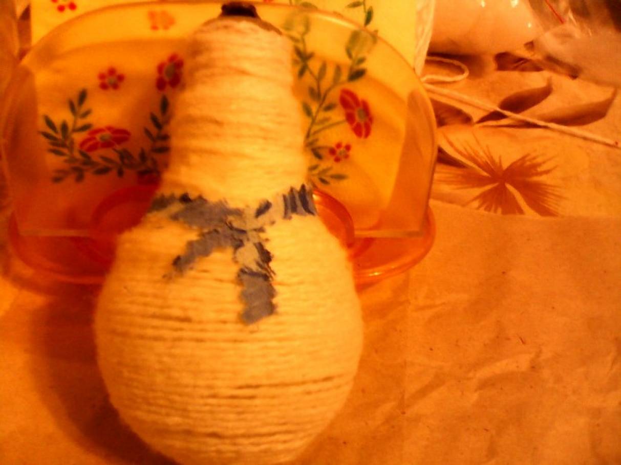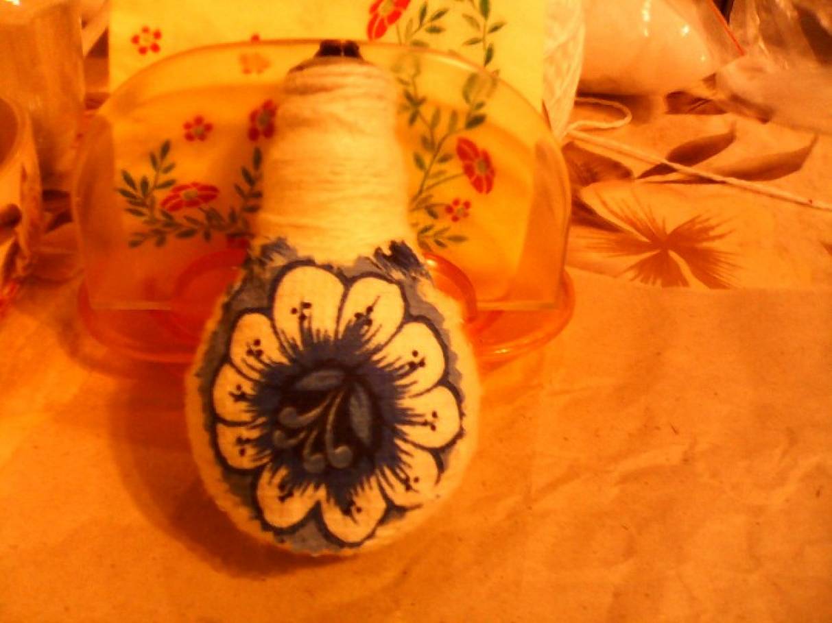 1. Вам понадобится: лампочка, белые нитки для вязания, клей-пистолет, полотенце с рисунком гжель, бусины, ленты и т. д. Обматываем лампочку нитками, пользуемся клеем или клеевым пистолетом.