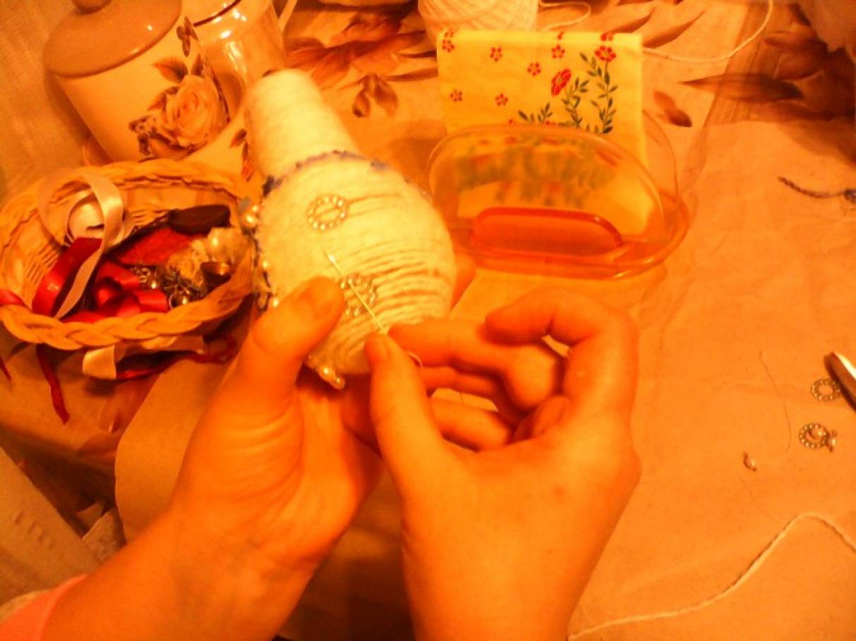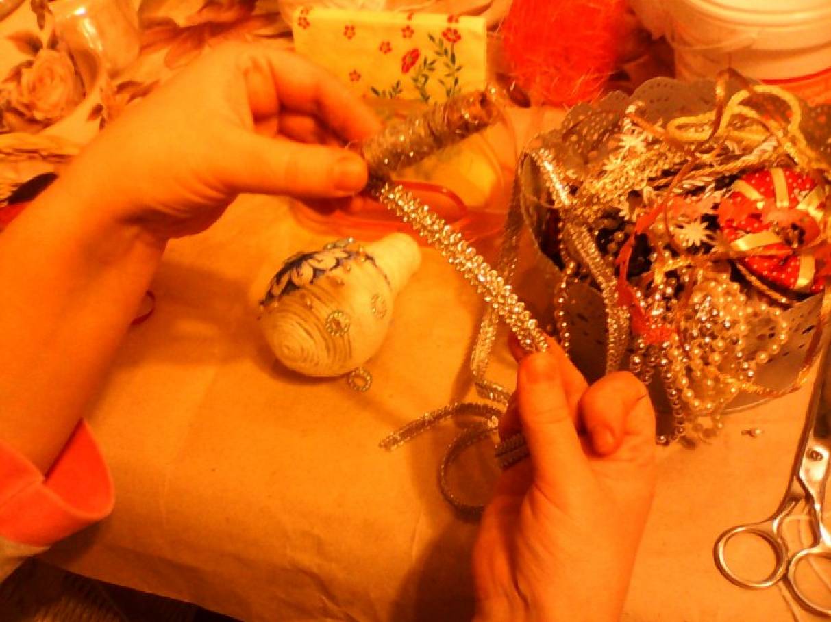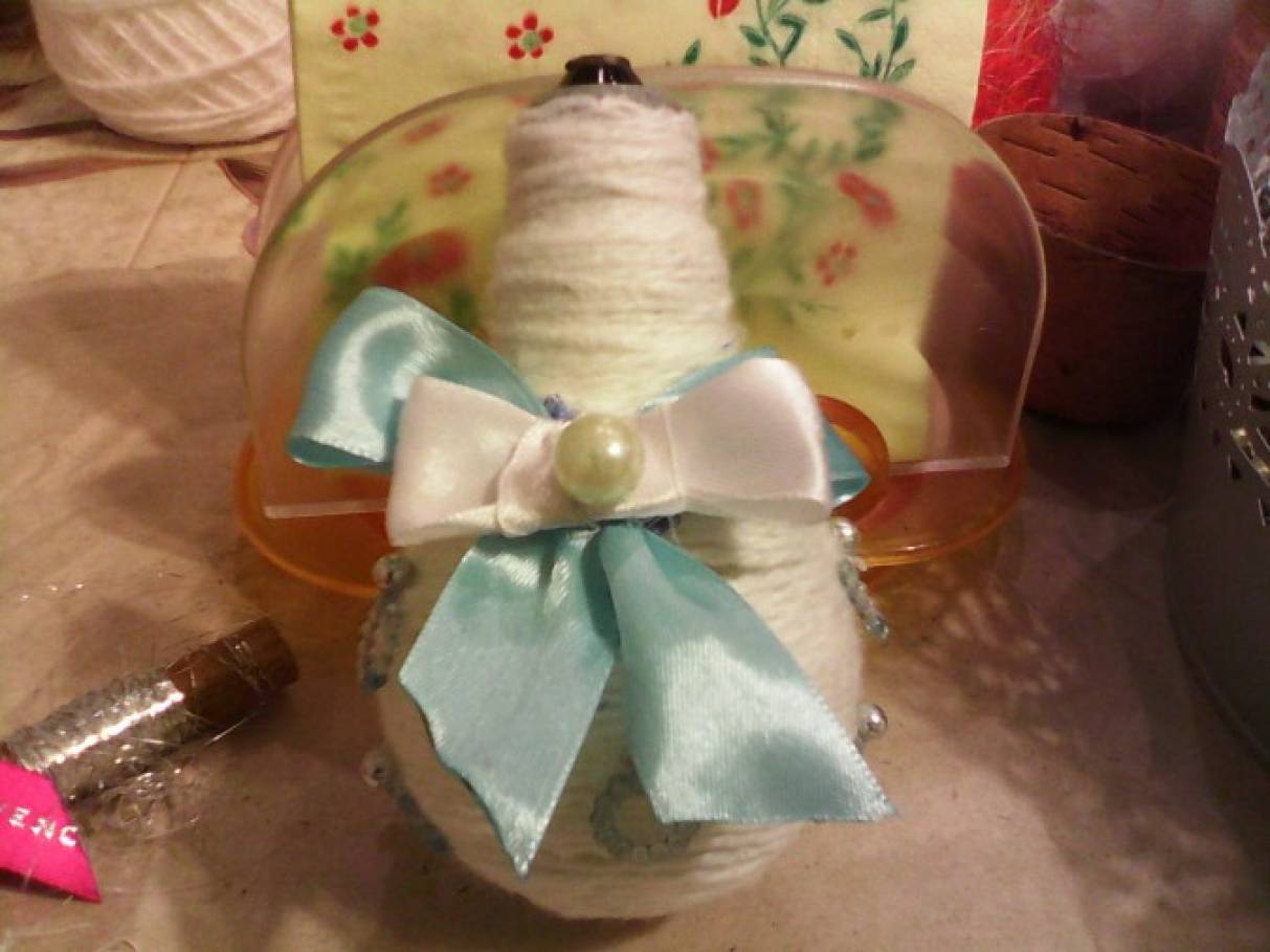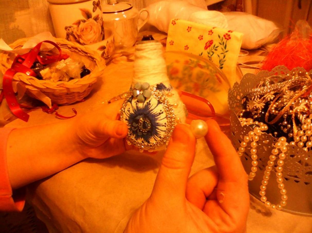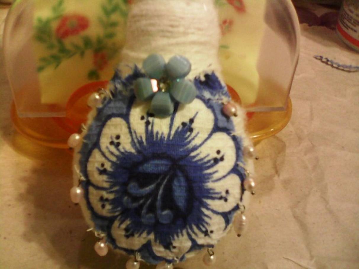 1. Вам понадобится: лампочка, белые нитки для вязания, клей-пистолет, полотенце с рисунком гжель, бусины, ленты и т. д. Обматываем лампочку нитками, пользуемся клеем или клеевым пистолетом.