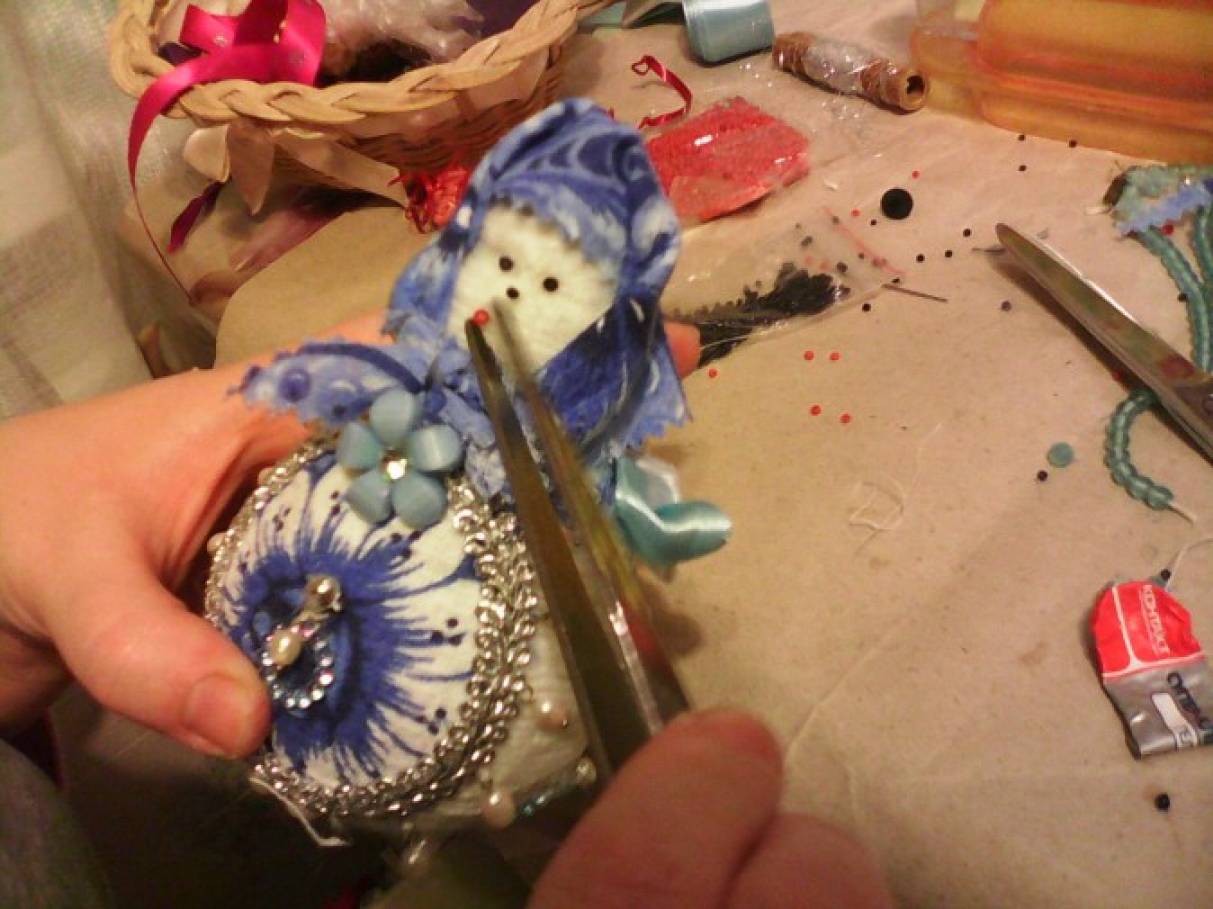 7. Одеваем ей на голову платочек, глазки, носик и ротик — из бисера.