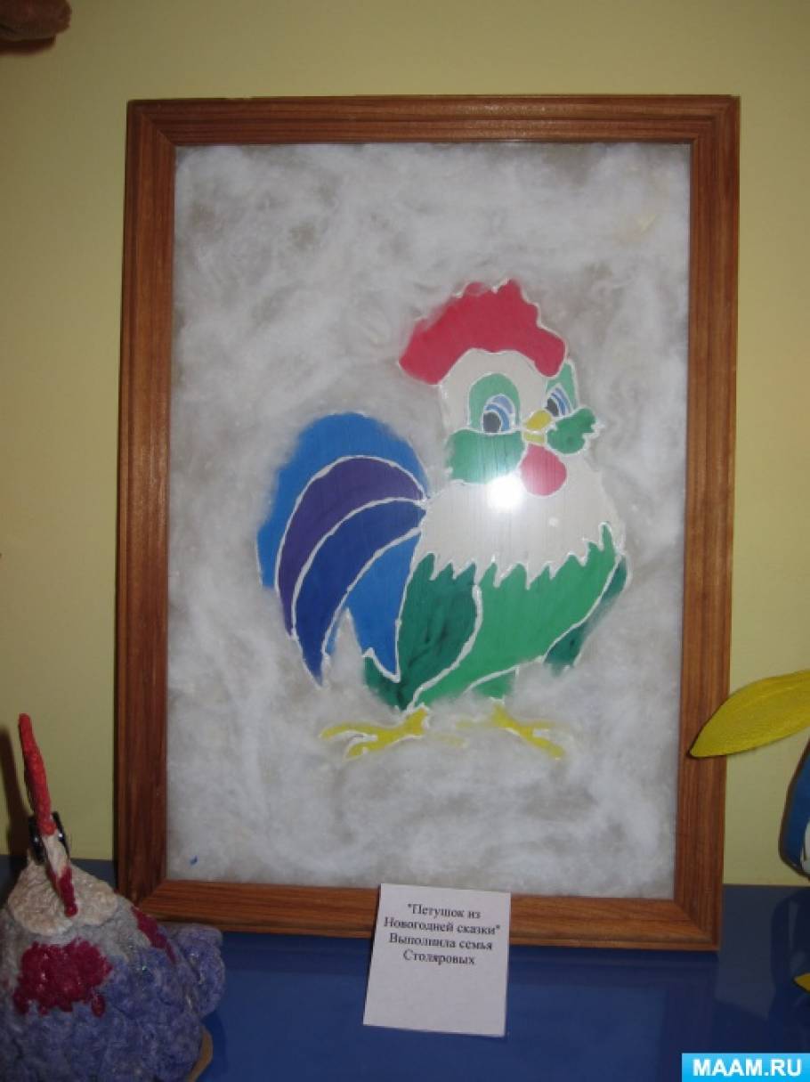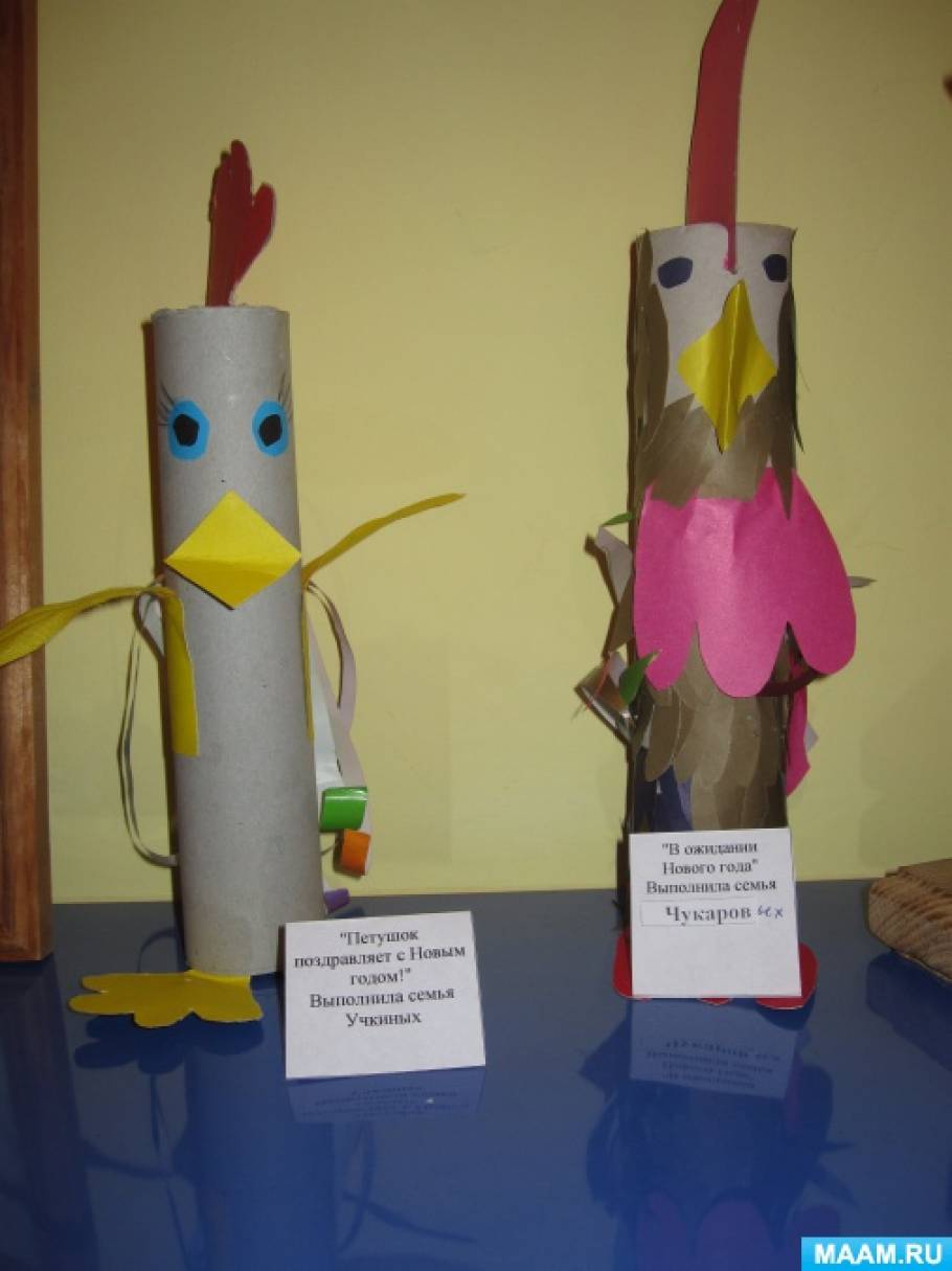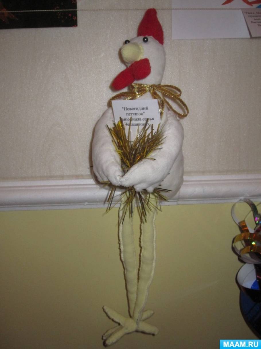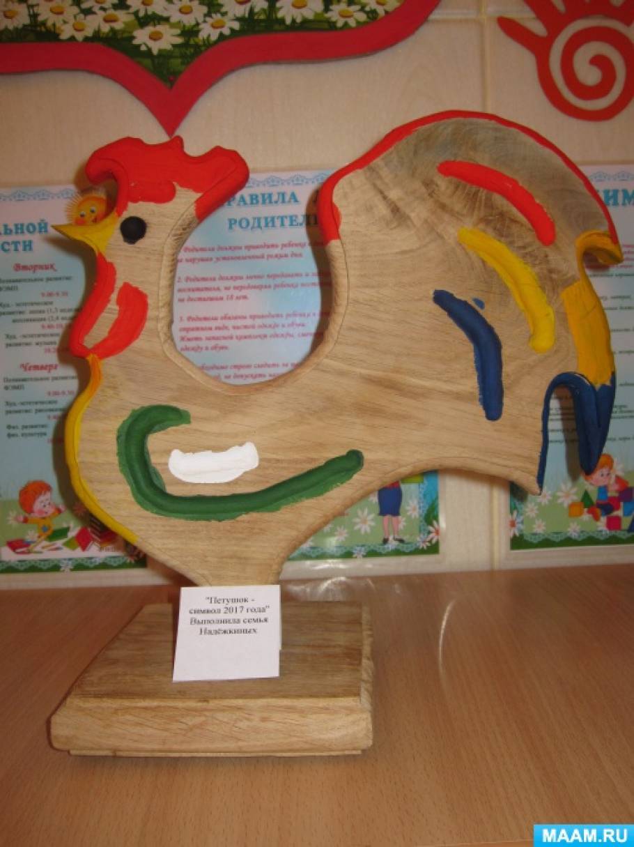 В моей группе, традиционно, была организована выставка под названием «Новогодний талисман». Родители активно поучаствовали в изготовлении поделки символа года — петуха. Выставка получилась интересная, яркая, творческая.