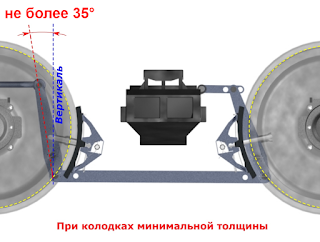 При колодках, имеющих толщину менее 40 мм, но ещё не достигших минимальной толщины, внутренний вертикальный рычаг может иметь наклон своим верхним плечом в сторону от шкворневой балки.
