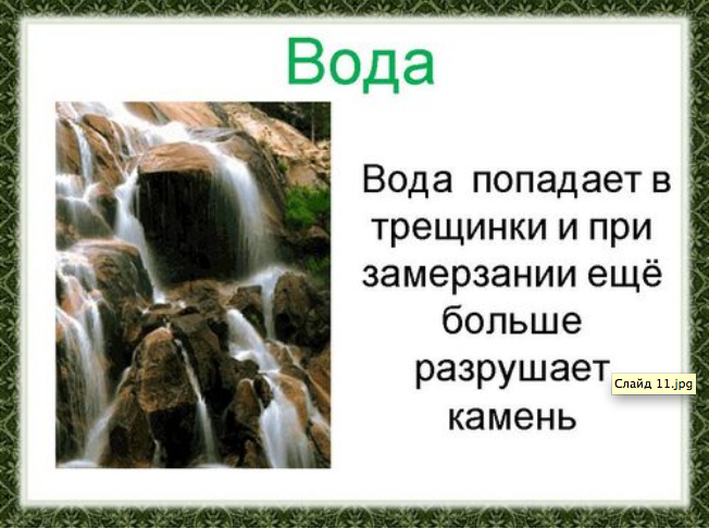 Вспомните особое свойство воды. Что происходит с водой при замерзании? (расширяется) Как это может повлиять на разрушение гор? (Таяние снега в горах под влиянием солнца или дождь приводят к тому, что вода попадает в трещинки и при замерзании ещё больше разрушает камень.)
