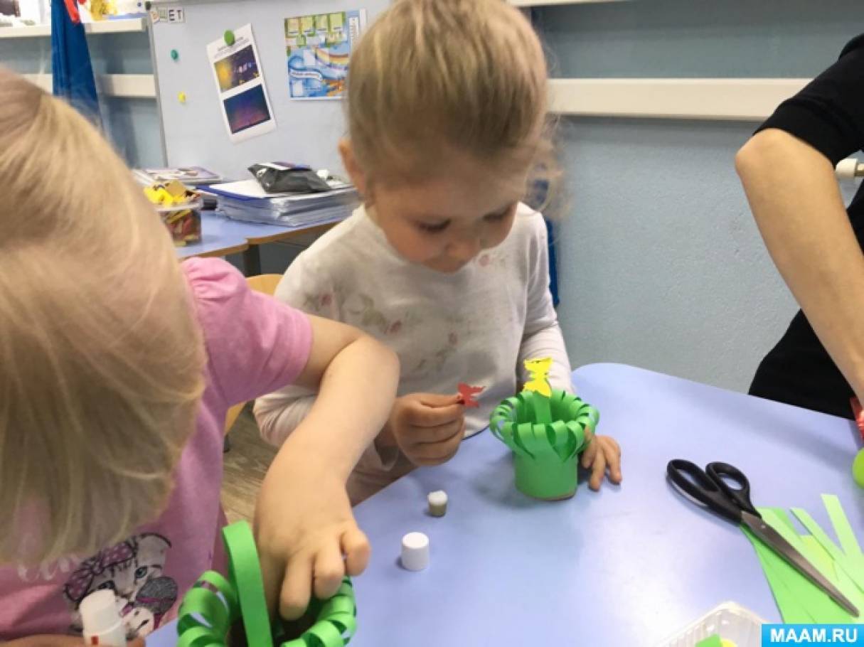 Для изготовления поделки нам понадобились : втулки из под бумажных полотенец или туалетной бумаги, цветная бумага (зеленая- для корзинки; красная, желтая, синяя — для цветов и бабочек, ножницы, клей, фломастеры.