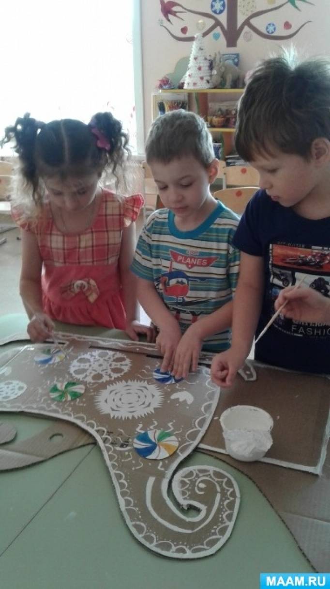 Украшения, изготовленные руками ребятишек, позволили им окунуться в эту атмосферу намного раньше Нового года. Ребята с удовольствием помогали создавать пряничную сказку : раскрашивали леденцы, расписывали прянички, украшали сани, домик. Пряничный домик, олени и сани мы смастерили из картонных коробок. Вот какая у нас получилась «Пряничная сладкая сказка»!