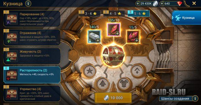 Кузница Raid Shadow Legends позволяет создавать артефакты с помощью материалов, заработанных в игре. Материалы можно получить, например, в боях на арене, Роковой башне, Войнах фракций, а также за участие в событиях и турнирах.