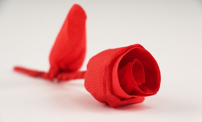 От красной бумажной салфетки отрезается третья часть. Оставшаяся часть складывается пополам. Отрезанный кусок накладывается на середину, и салфетка скручивается вокруг пальца. Плотно скручивать не нужно. Из получившегося цилиндра формируется бутон. Угол зеленой салфетки оборачивается вокруг ножки бутона и закручивается по спирали.