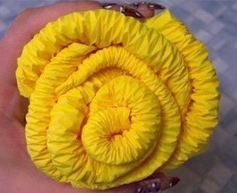 6 ШАГ – В конце оформляем до конца получившийся бутон, для этого беремся за край салфетки который находится в центре бутона и прокручиваем по спирали к центру. Все роза из салфетки готова!
