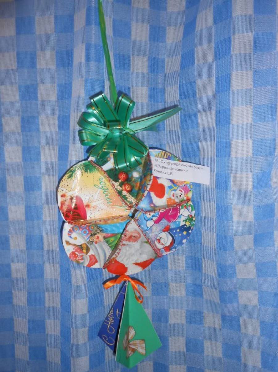 Нашла бант от подарка, присоединила с верху. Вниз приклеила из открыток ещё фонарик. Вот что у меня получилось.