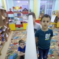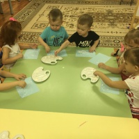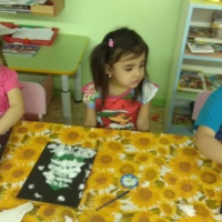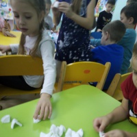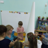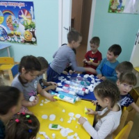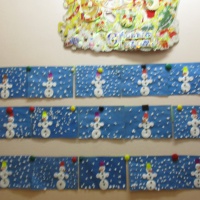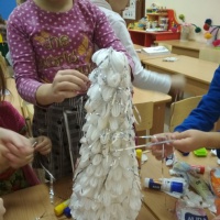 Следующее что я делала из ватных дисков это шары чтобы украсить группу. Их я сделала 7 штук они в определенной последовательности свисали с люстр. Было очень даже красиво.