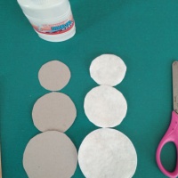 Изготовить его очень просто. Для туловища и головы я скомкала два комка из обычной газеты и перевязала их нитками чтобы не растрепались. Далее склеила их между собой клей пистолетом, а потом стала обклеивать ватными дисками, сгибая диск два раз. По такому же принципу я делала руки и ноги, а потом их приклеивала к снеговику.