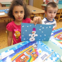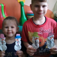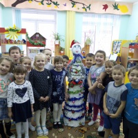 Нос и рот сделал из цветной бумаги, глаза от старой мягкой игрушки, на голову одела новогодний колпак и на шею привязала бантик. Считаю, что получилось не плохо.