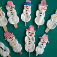 - Не менее креативный вариант со снеговиком на деревянной палочке. Его можно использовать как закладку для книги или украшение для стаканчика с ручками.