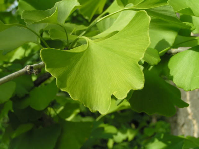 Листья светло-зеленые, веерообразные, слегка волнистые по краю, кожистые, но при этом очень мягкие, как правило, рассеченные на две лопасти. Осенью они окрашены в яркий золотисто-желтый оттенок.