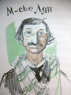 или М-сье Лян, учитель французского «…кажется человеком, упавшим с луны: не знает в лицо ни одного гимназиста, никогда не соображает в каком классе находится, и в течении нескольких лет не научил нас ни единому французскому слову… Но все же в нем есть что то милое… В сущности чем плох его шарф? М-сье Лян не только обматывает им свою тощую, зябкую шею, но и чистит им туфли, и стирает им мел с доски. В него же он часто и гулко сморкается».