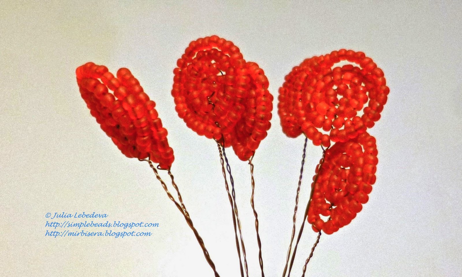 Берём проволоку 27 см, делаем не большую петлю, оставляя ось 4 см, на ось набираем 5 бисерин и делаем рабочей проволокой 4 дуги (2 оборота).