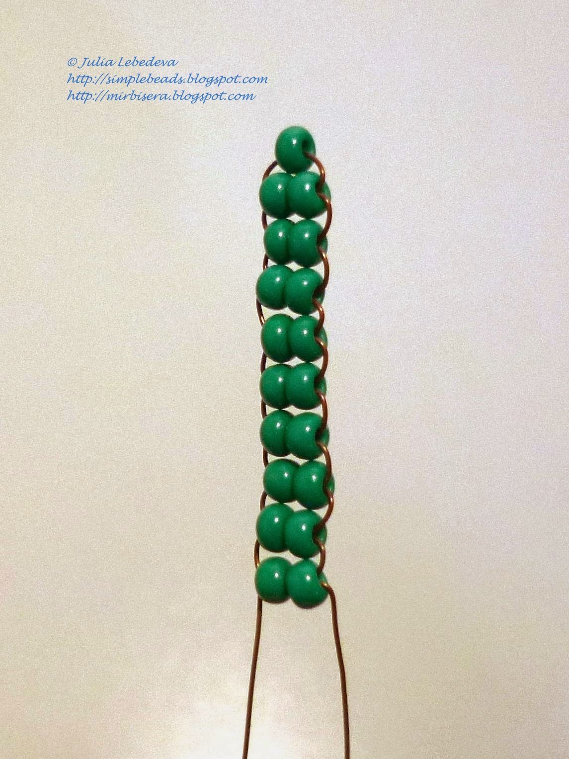 Каждый из двух верхних листиков я сделала из 10 рядов бисеринок на проволоке длиной 60 см,