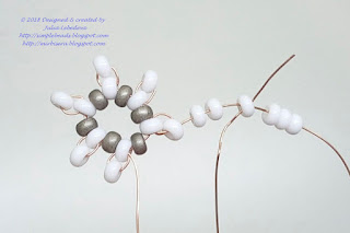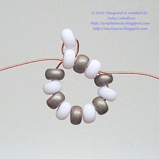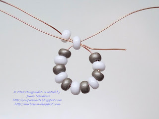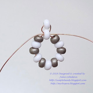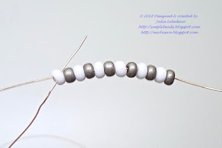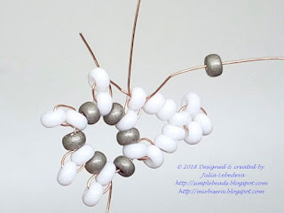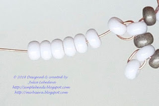 Выбираем тот конец проволоки, который выходит из серой бисеринки, и пропускаем его через крайнюю белую бисеринку со стороны другого конца проволоки.