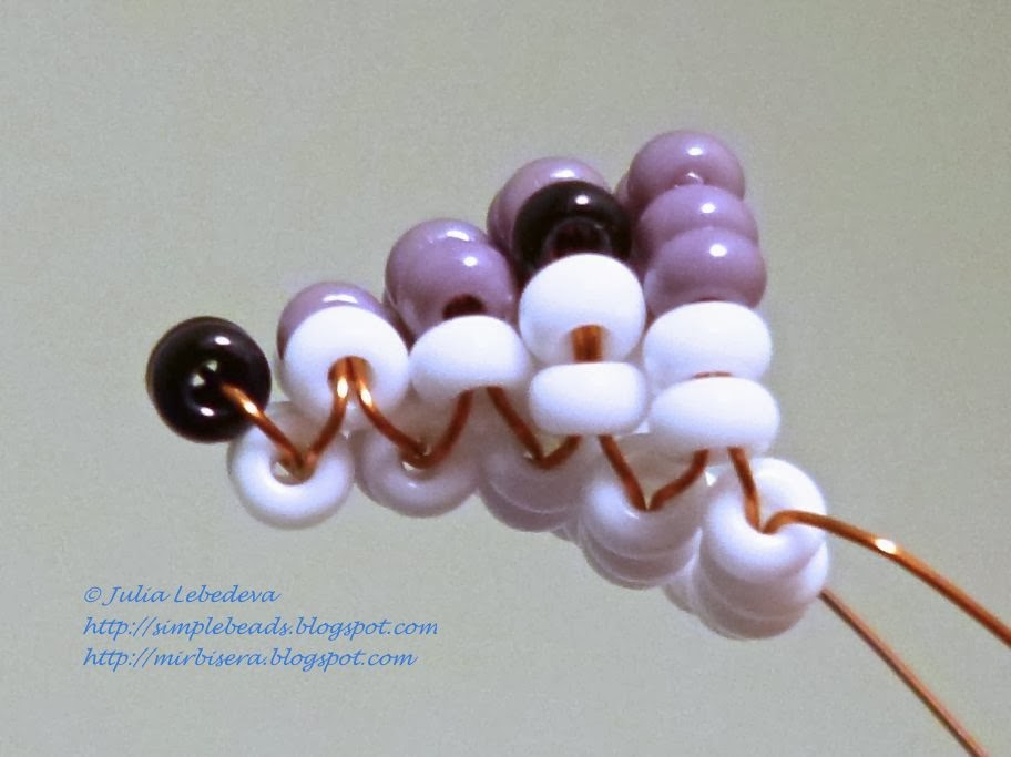 Верхний ярус — набираем бисеринки в следующем порядке: 2 белые, 1 чёрная, 2 серые, 1 чёрная, 2 белые.