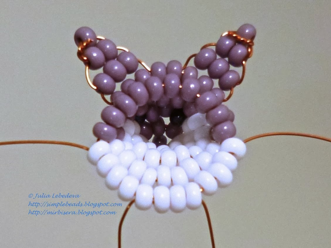 Закрепляем и отрезаем лишнюю проволоку, на которой мы сплели уши, а кончики скрутки прячем между рядами бисеринок.