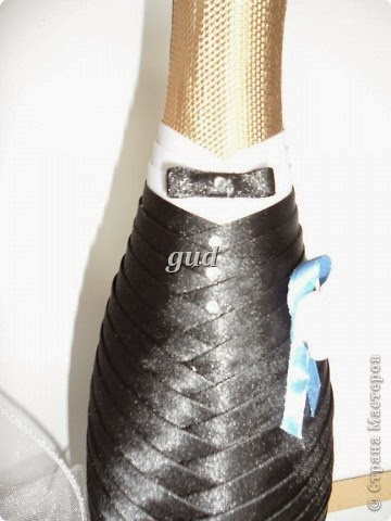 3. Отмериваем и отрезаем кусочки ленты, и наклеиваем ее на бутылку. Делаем сначала жениха. Рубашечку делаем из двух кусочков белой ленты.