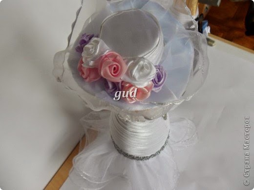 10. Вот и невеста готова. Будем делать ей юбку. Бейки уходит 11 м если делать на бутылку, чтобы не просвечивалась. Можно заранее покрасит ее в белый цвет — соответственно расход ленты будет меньше.