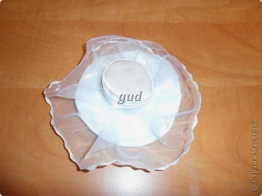 Основа платья невесты готова. Далее сделайте для нее юбочку (фото 10). В данном случае в качестве юбочки использовался детский бант из фатина (также подойдет атласная тканб или фатин). Бант был сложен напополам, стянут нитью и приклеен к бутылке.