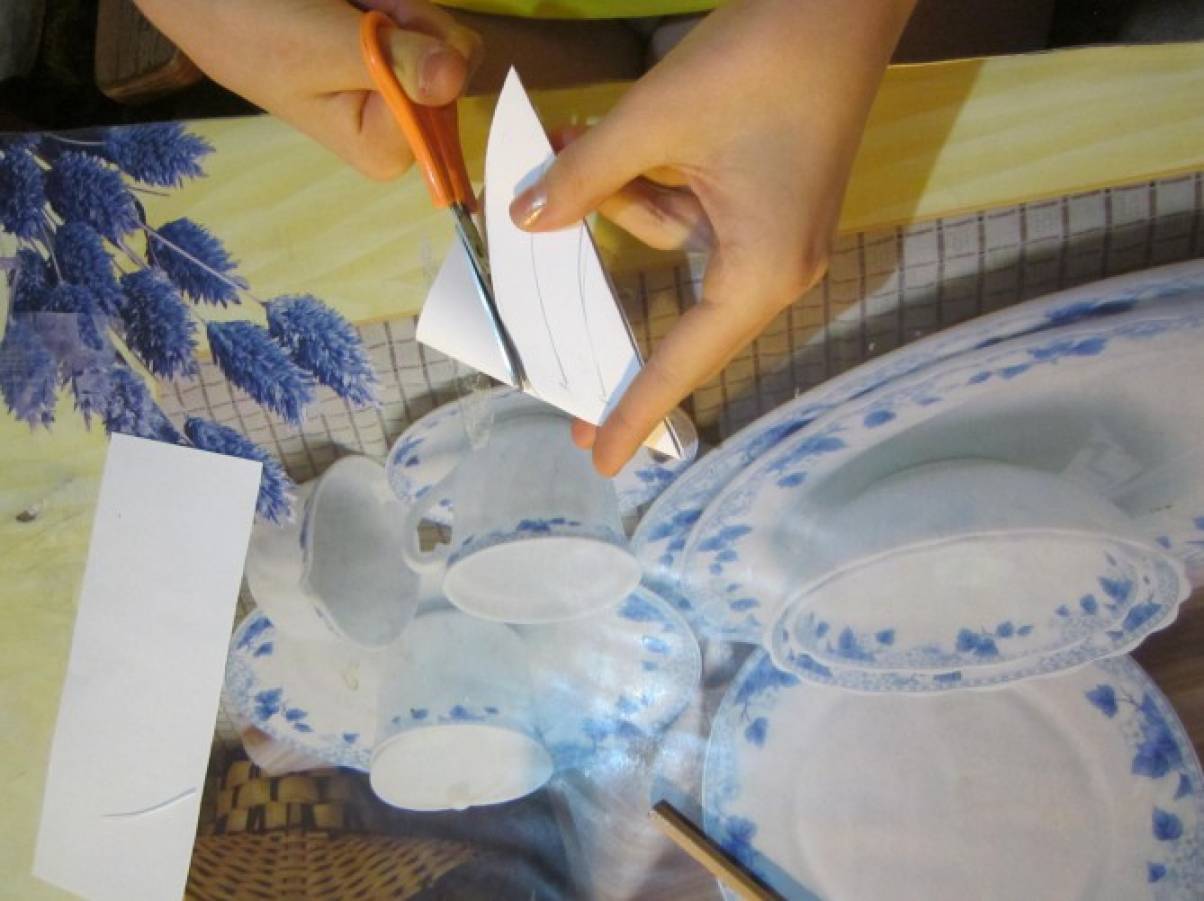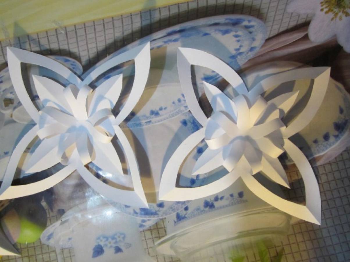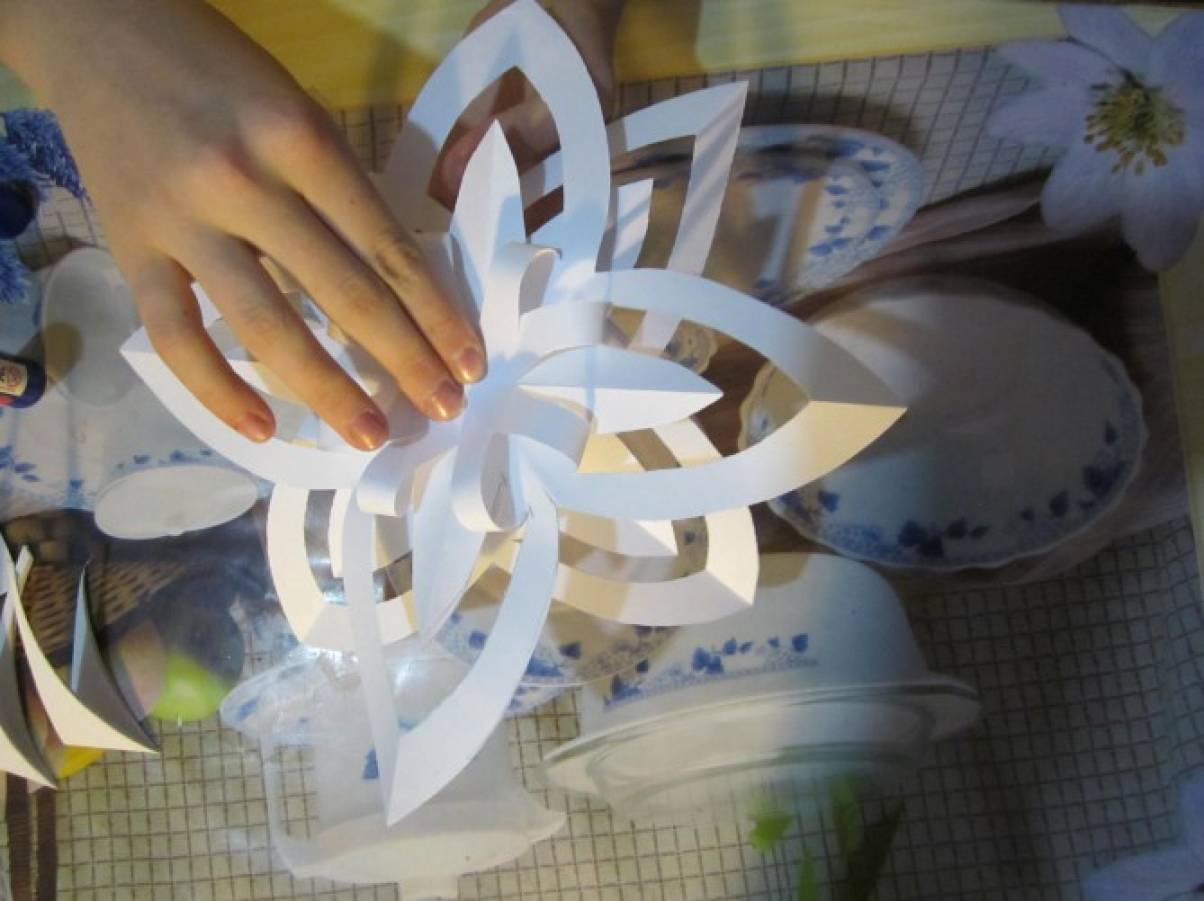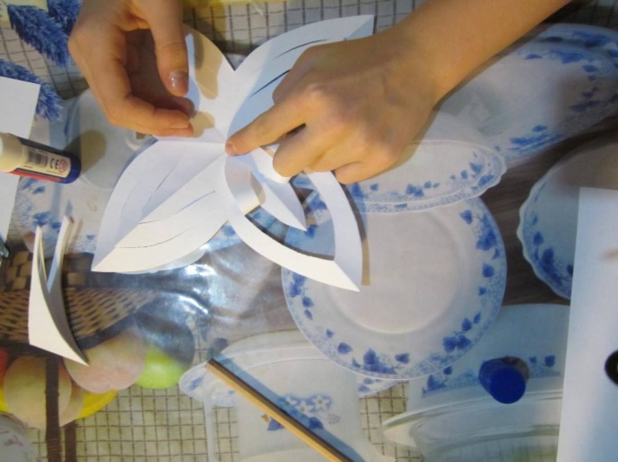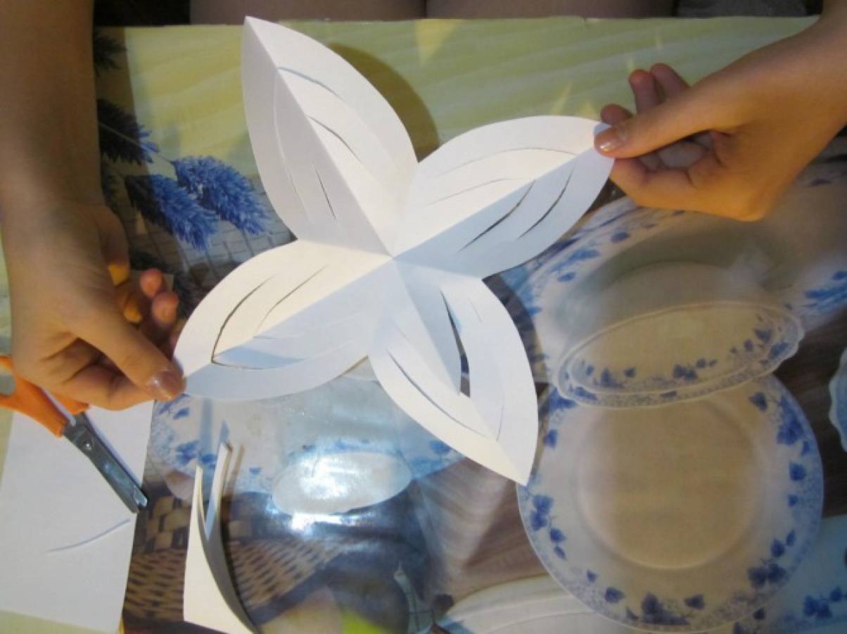 А иногда помощь приходит совсем неожиданно от внучки. Она у меня очень любит садик, ребятишек, хотя уже давно выпустилась, шестиклассница. Вот и в этот раз показала очень простую и интересную снежинку. Моим подготовишкам очень понравилась снежинка, а главное они сами стали делать. Лишь на первой карандашом отметили линии разреза.