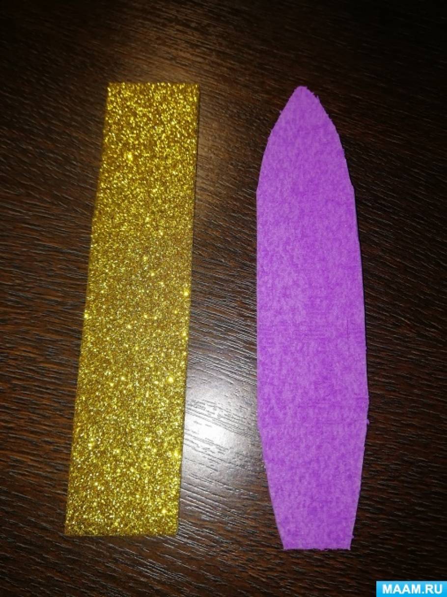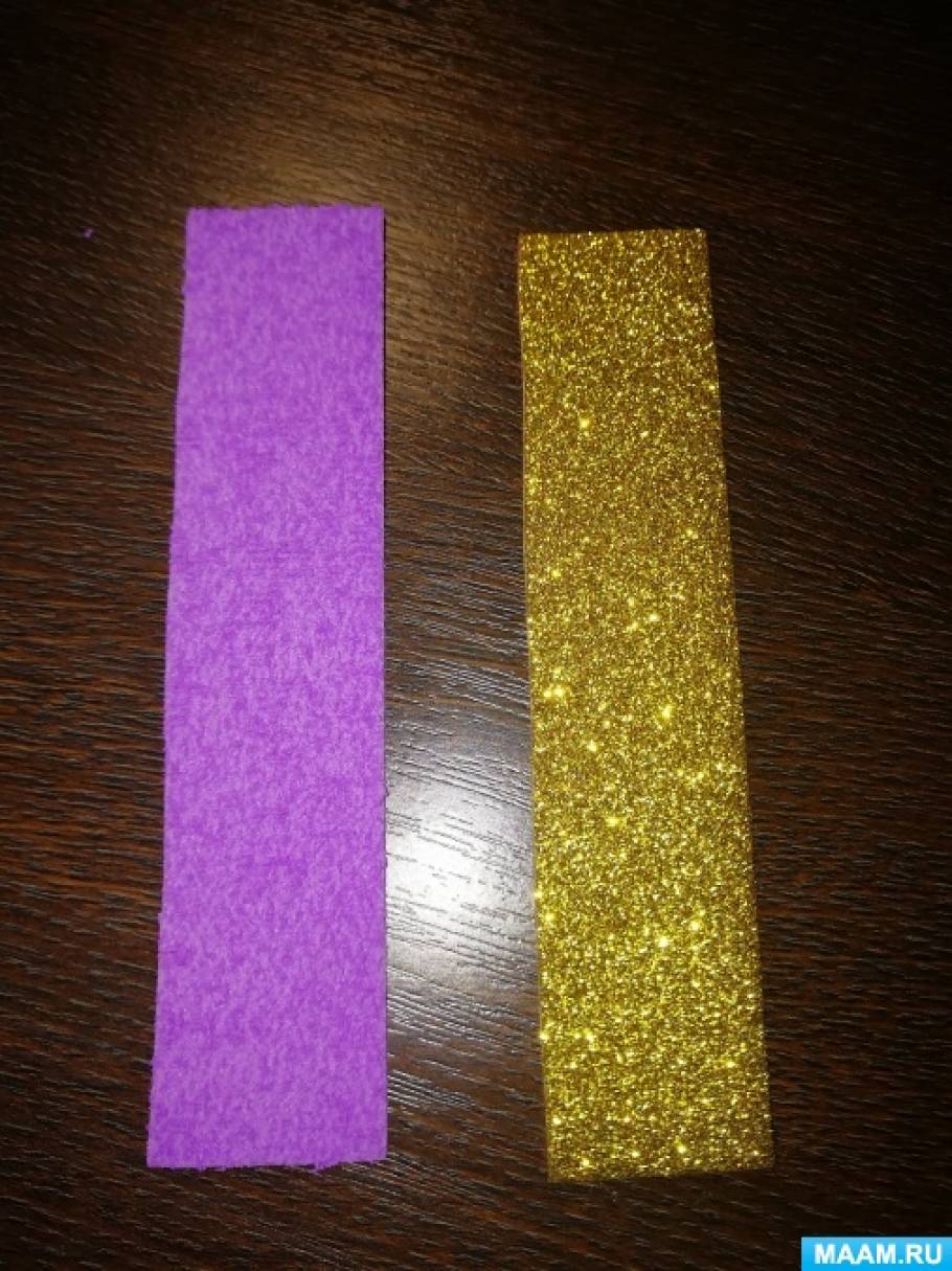 Из желтого и сиреневого фоамирана вырезаем 2 полоски 14 см на 3 см.